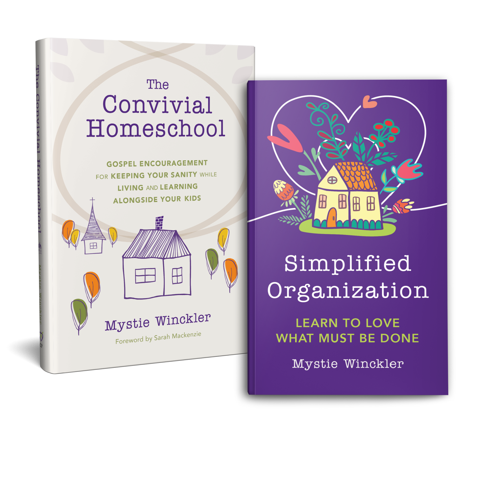 Hi! My husband and I are both second-generation homeschoolers who now have two homeschool graduates and three still at home being educated. When we got married at 19, I assumed homemaking would be easy – just cook, clean up, and have plenty of time left over to read. Not so. Homemaking – and homeschooling and mothering – have been God’s path of humility and sanctification for me. Now, I wouldn’t have it any other way. Let me share not only what I know now, but also how to walk the path of sanctification with a full life at home.