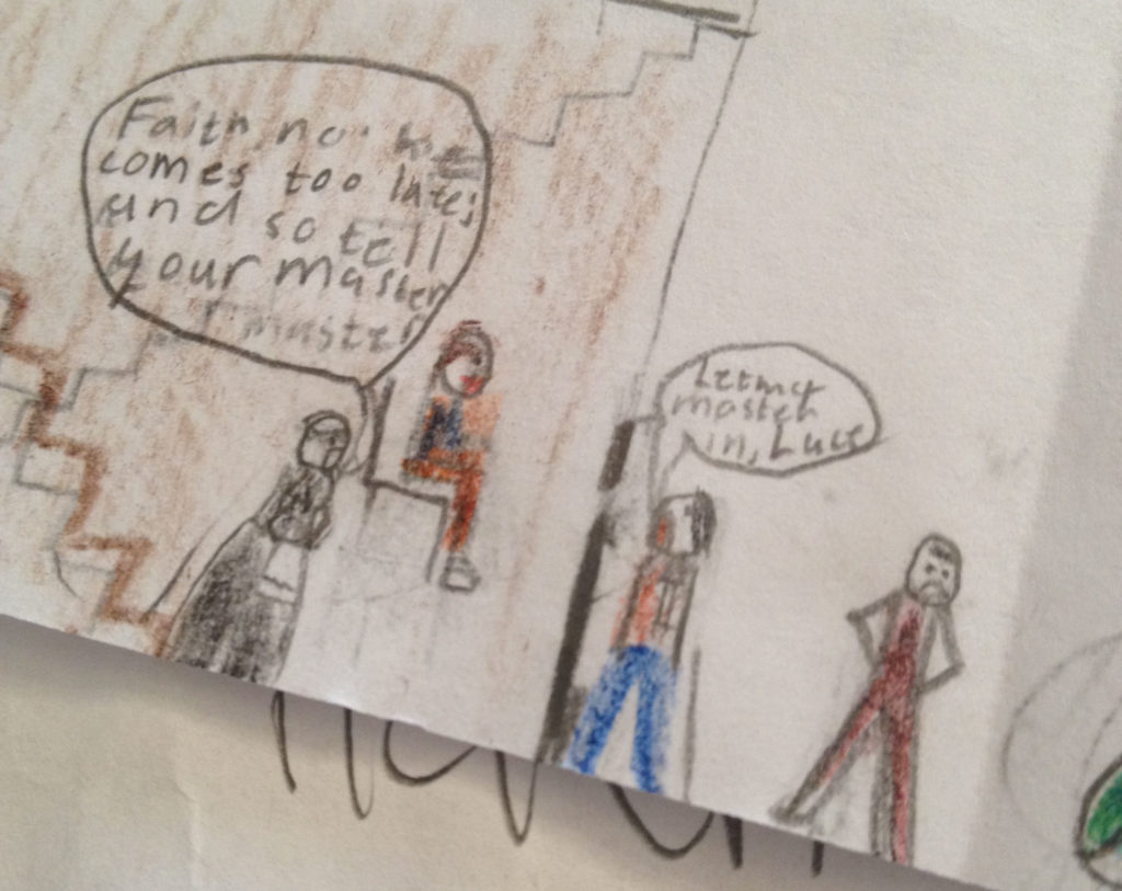 After we had seen, listened to, and memorized from The Comedy of Errors, the children illustrated their favorite scene. The older students copied lines from the play onto their scene, and each child showed their illustration and described the scene they had portrayed.