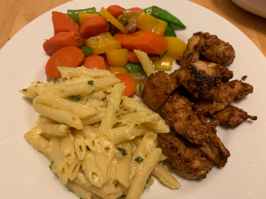 This week I received the latest edition and there was one such recipe: Decadent, Cheesy Pasta in a Flash. All the ingredients were normal things I already had on hand. So I made sautéd chicken, sautéd veggies, and cheesy pasta. The new-to-me tactic was using egg as the main sauce base; it cooks when added to the piping hot pasta immediately after draining it.