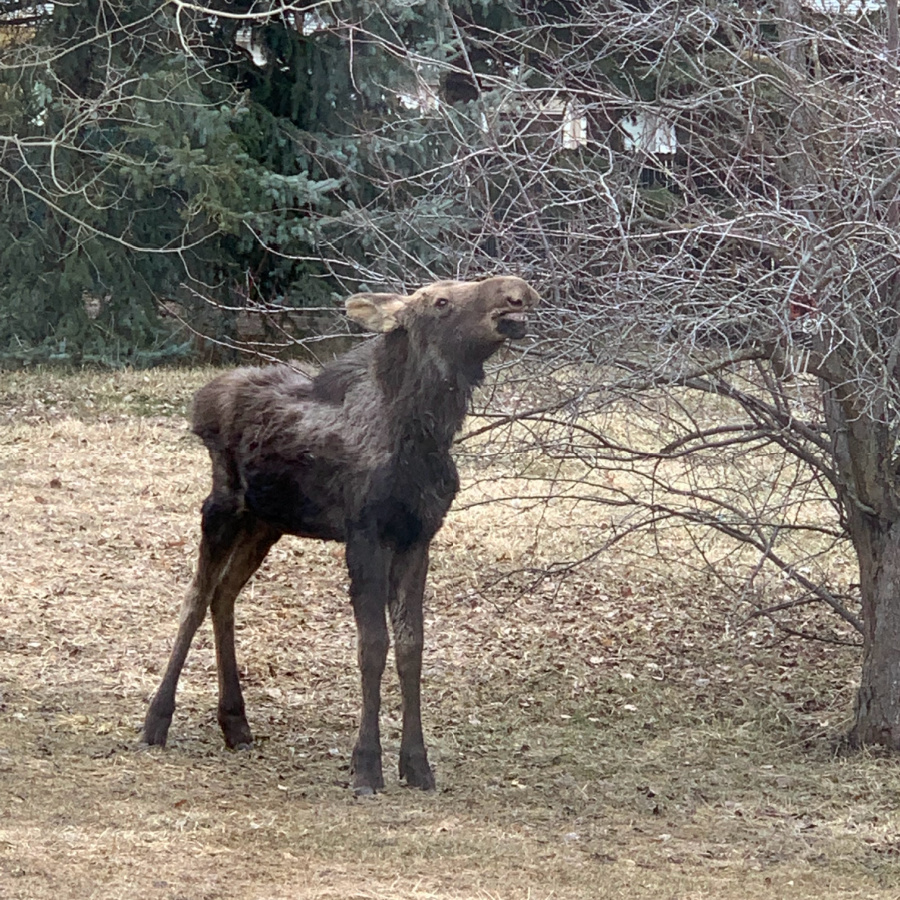 Then, Friday morning, we looked out the window and saw a moose calf eating the trees! We stayed inside and texted pictures to friends and family.