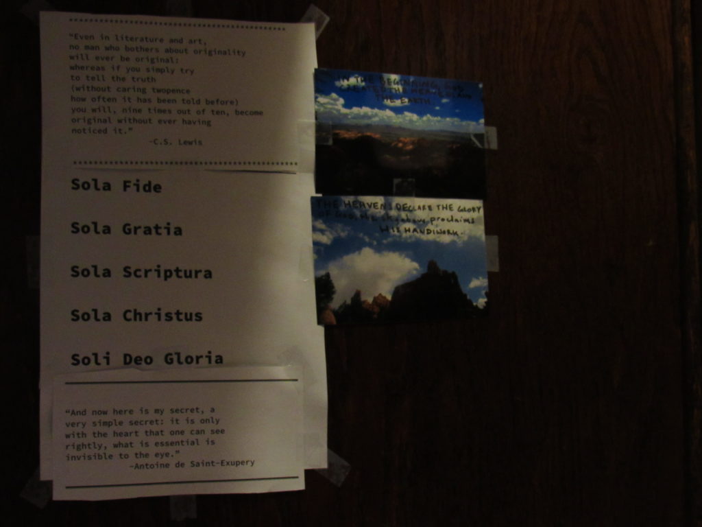 This leads me to my first Teenager Tip: one thing that helps live through this slog we call high school is making a collage of favourite quotes, cool pictures, Bible verses, and one or two things that you find very important in your life. This is mine that I unceremoniously taped to the side of my workspace: