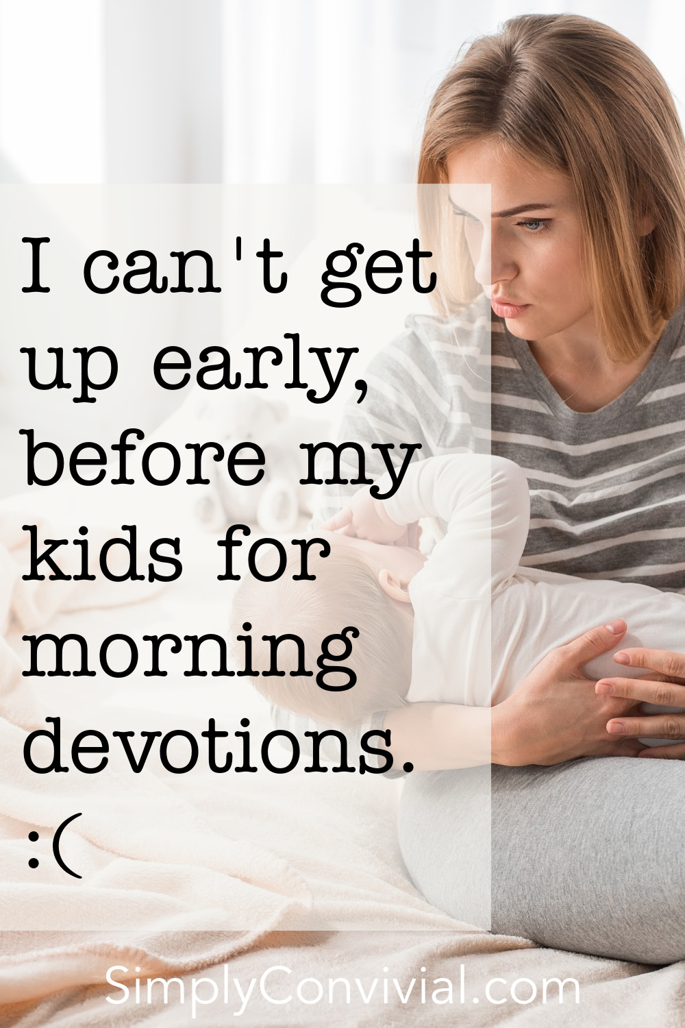 So then when our mornings begin by being tossed from bed by a crying infant, when we don’t have ten minutes together without being interrupted, when we never make it to our candle-lit reading corner, we wind up never actually beginning the day with prayer and Scripture.