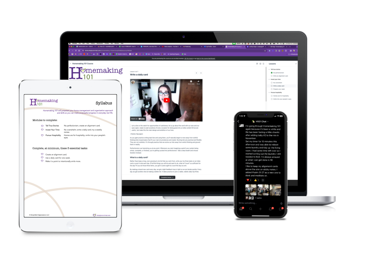 Homemaking 101 is a quick, 3-module course that should take you 3 weeks or less to complete. The modules are available in written or audio form.